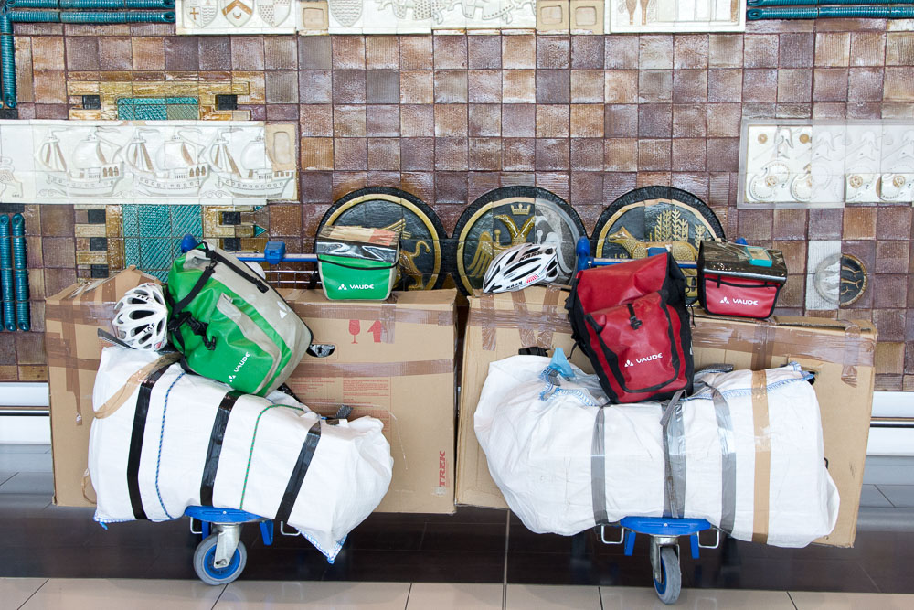Our makeshift luggage bags to transport our bikes and panniers. The distracting background makes it appear we have three wheels sticking out of our boxes!