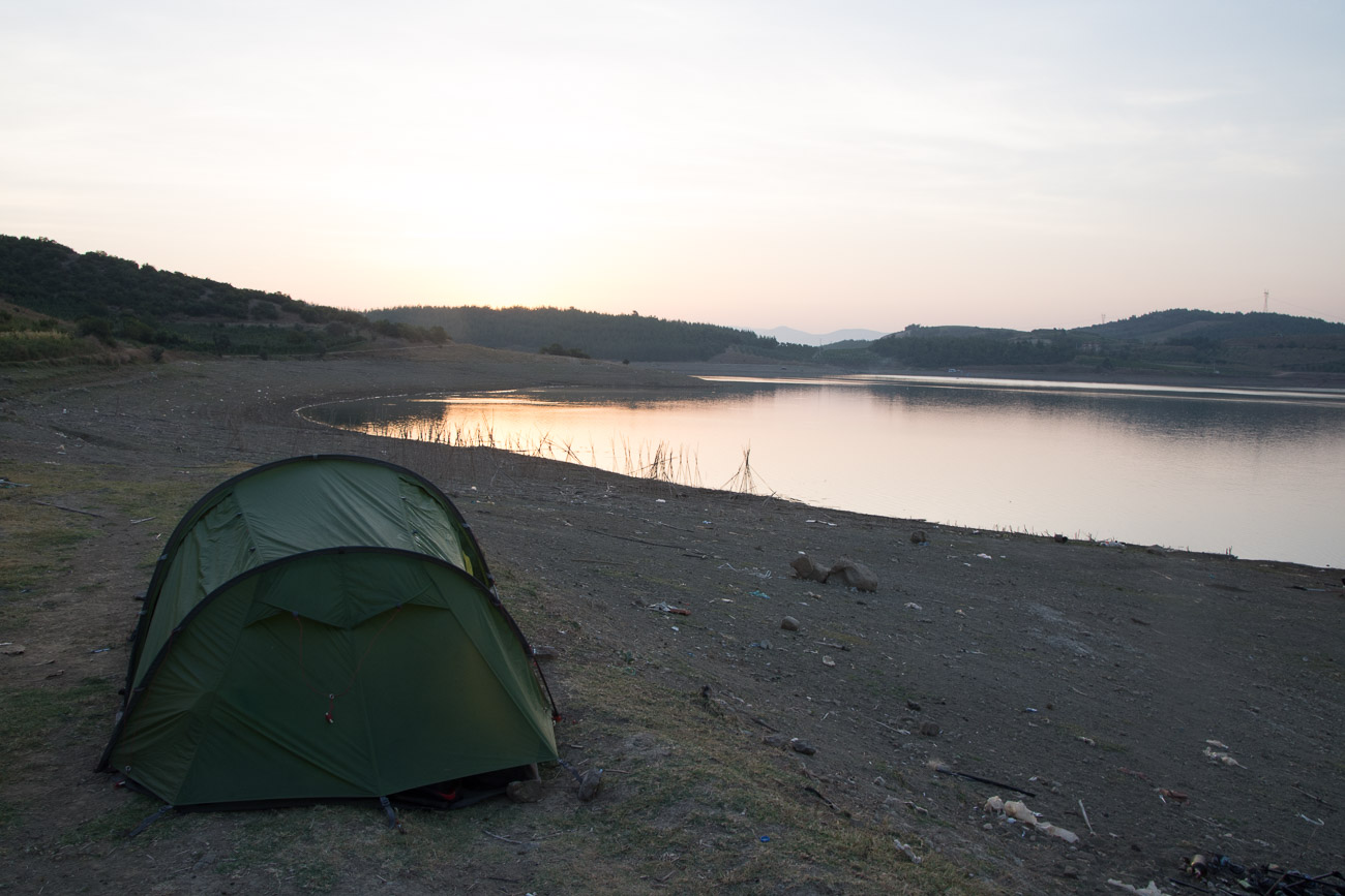 We pitched the tent on the shores of the reservoir where we met a couple of local fishermen who were also camped nearby and who took great interest in trying to help us pitch our tent and chase away the local stray dogs that repeatedly approached. After performing our own rituals of pitching, washing, cooking and eating the the call to prayer drifted in the breeze across the still water as we drifted off to sleep.